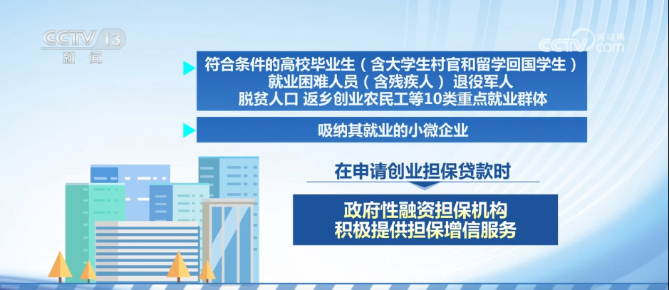 政策明确,符合条件的高校毕业生(含大学生村官和留学回国学生)、就业困难人员(含残疾人)、退役军人、脱贫人口、返乡创业农民工等10类重点就业群体,以及吸纳其就业的小微企业,在申请创业担保贷款时,政府性融资担保机构积极提供担保增信服务。